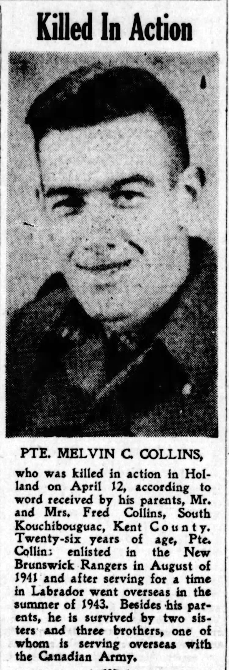 Son of Frederick J. and Elsie I. Collins, of South Kouchibouguac, Kent Co., New Brunswick.