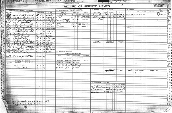Son of Alcide F. and Rose (née Rivest) Deschamps, of Windsor Ontario. The eighth child of fourteen children. His baptism is recorded at L'Annunciation in Stoney Point, 31 May 1919. At the time of his death he was engaged to a young woman named Ethel Pool. Apparently he was commonly called Lee.