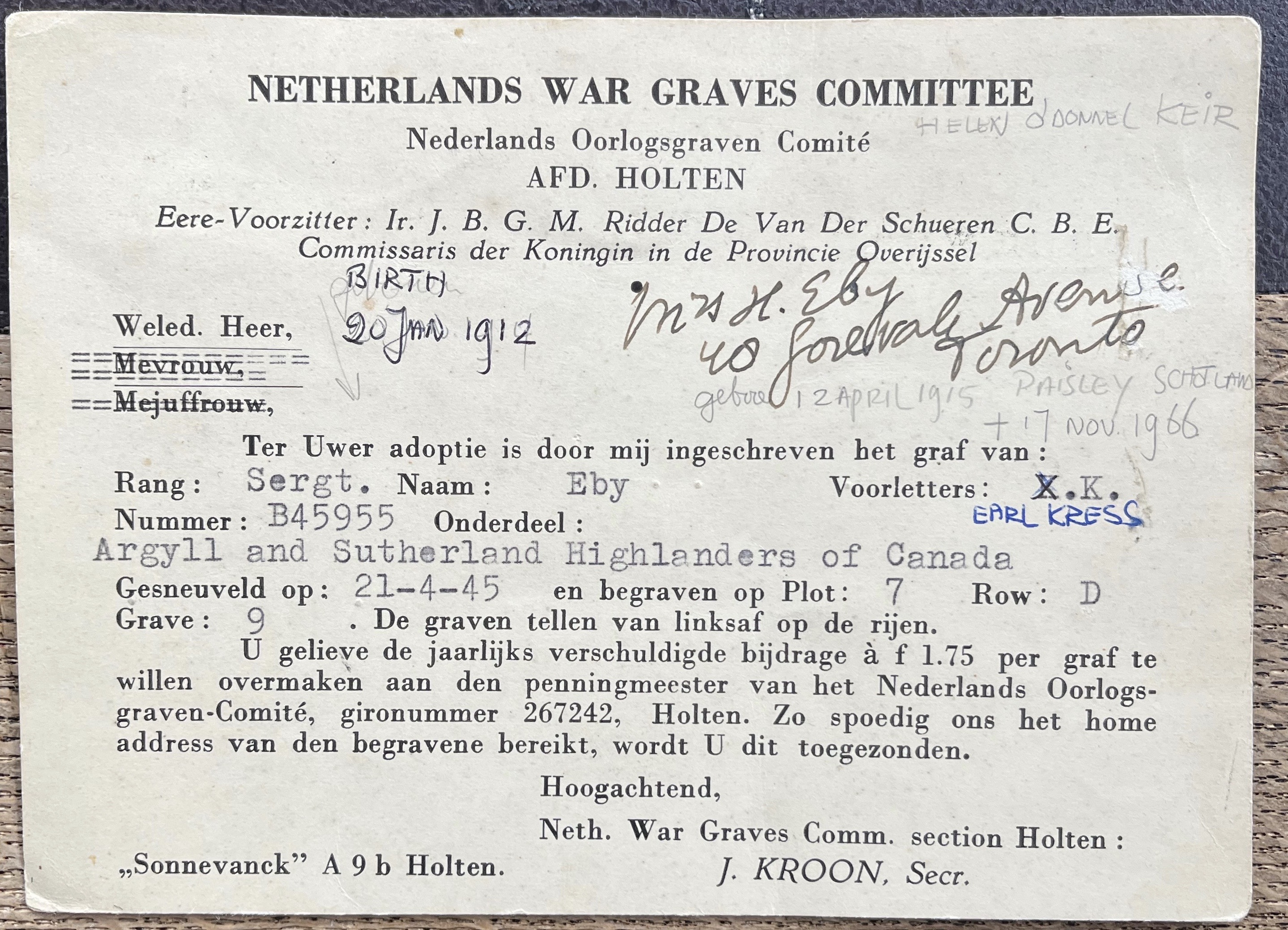 Historical Information: The Netherlands fell to the Germans in May 1940 and was not re-entered by Allied forces until September 1944. The great majority of those buried in Holten Canadian War Cemetery died during the last stages of the war in Holland, during the advance of the Canadian 2nd Corps into northern Germany, and across the Ems in April and the first days of May 1945. After the end of hostilities the remains of over 1,300 Canadian soldiers were brought together into this cemetery.