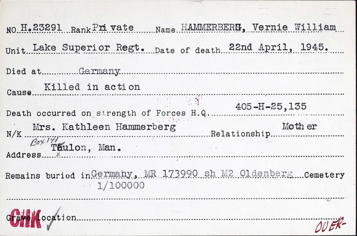 Historical Information: The Netherlands fell to the Germans in May 1940 and was not re-entered by Allied forces until September 1944. The great majority of those buried in Holten Canadian War Cemetery died during the last stages of the war in Holland, during the advance of the Canadian 2nd Corps into northern Germany, and across the Ems in April and the first days of May 1945. After the end of hostilities the remains of over 1,300 Canadian soldiers were brought together into this cemetery.