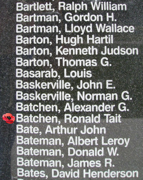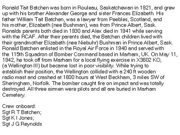 Son of Elizabeth (née Bushman) and William Tait Batchen of Rouleau, Saskatchewan. William Tait Batchen was born in Peebles, Scotland and married Elizabeth in Prince Albert, Saskatchewan. He started a law practice. They had three children, a daughter, Frances who become a concert pianist in New York, Ronald and his brother, Sergeant Alexander George Batchen, died on September 12, 1941 at age 20, while serving with the Royal Canadian Air Force. He was the eldest of the children.