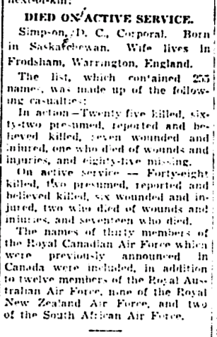 Originally from Prince Albert, Saskatchewan. The Province of Saskatchewan has named a lake in honour of Corporal Simpson. Simpson Lake is located at 52° 38' 00" N - 109° 32' 00" W. He is also honoured on the Prince Albert honour roll.