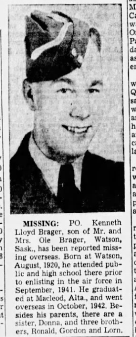 Son of Ole and Mabel (née Gillund) Brager. The Government of Saskatchewan named Brager Lake in memory of Kenneth Lloyd Brager, Watson, Saskatchewan. The plaque reads: On Active Service to His Country Killed in Action, December 20, 1943, Age 23, Hotton Cemetery. Brager Lake is 850 kms north of Watson, close to the North West Territory Border. (059o 21'N, 106o56'W)