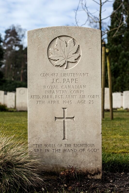 John Pape was a member of the Royal Canadian Infantry Corps, he died while serving with the 7th Parachute Regiment as a CANLOAN Officer.