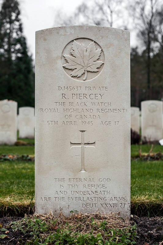 Historical Information: The Netherlands fell to the Germans in May 1940 and was not re-entered by Allied forces until September 1944. The great majority of those buried in Holten Canadian War Cemetery died during the last stages of the war in Holland, during the advance of the Canadian 2nd Corps into northern Germany, and across the Ems in April and the first days of May 1945. After the end of hostilities the remains of over 1,300 Canadian soldiers were brought together into this cemetery.