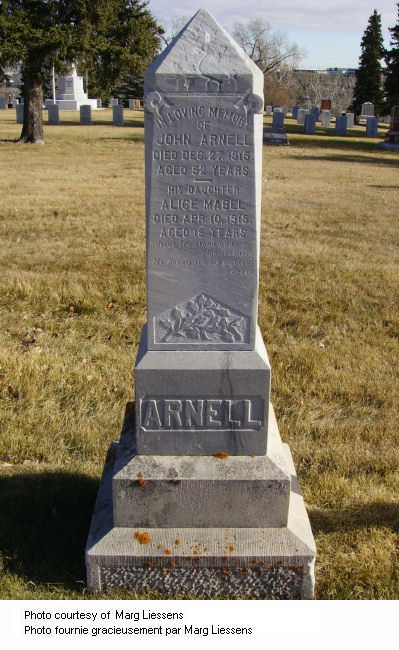 Husband of the Mrs. Jessie G. Arnell (remarried Robinson), of Gull Lake, Saskatchewan. Father of Pte James Alexander Arnell, 10th Battalion, killed in action 30 September 1915. Pte Arnell had Canada service only.