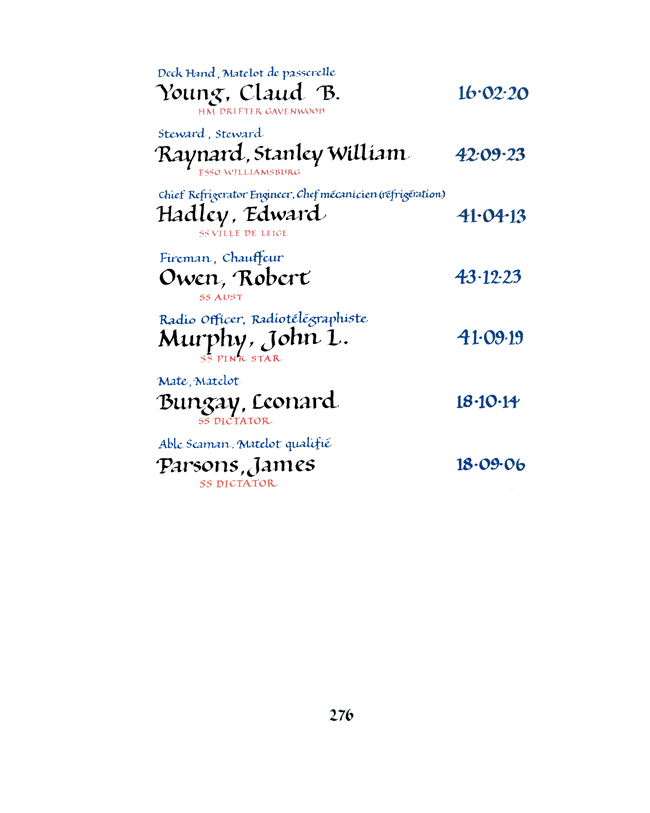 Son of Edward and Florence Hadley of Hamilton, Ontario. Husband of Sarah Hadley, of Brooklyn, New York. Brother of Petty Officer James Hadley, cook on board the S.S. Ilex. Edward and James returned to England and joined the British forces for the duration of the war. A younger brother, Thomas, is serving with the Royal Navy as an able-seaman gunner onboard one of Her Majesty's ships and brother George is an electrician in the government service in Britain.