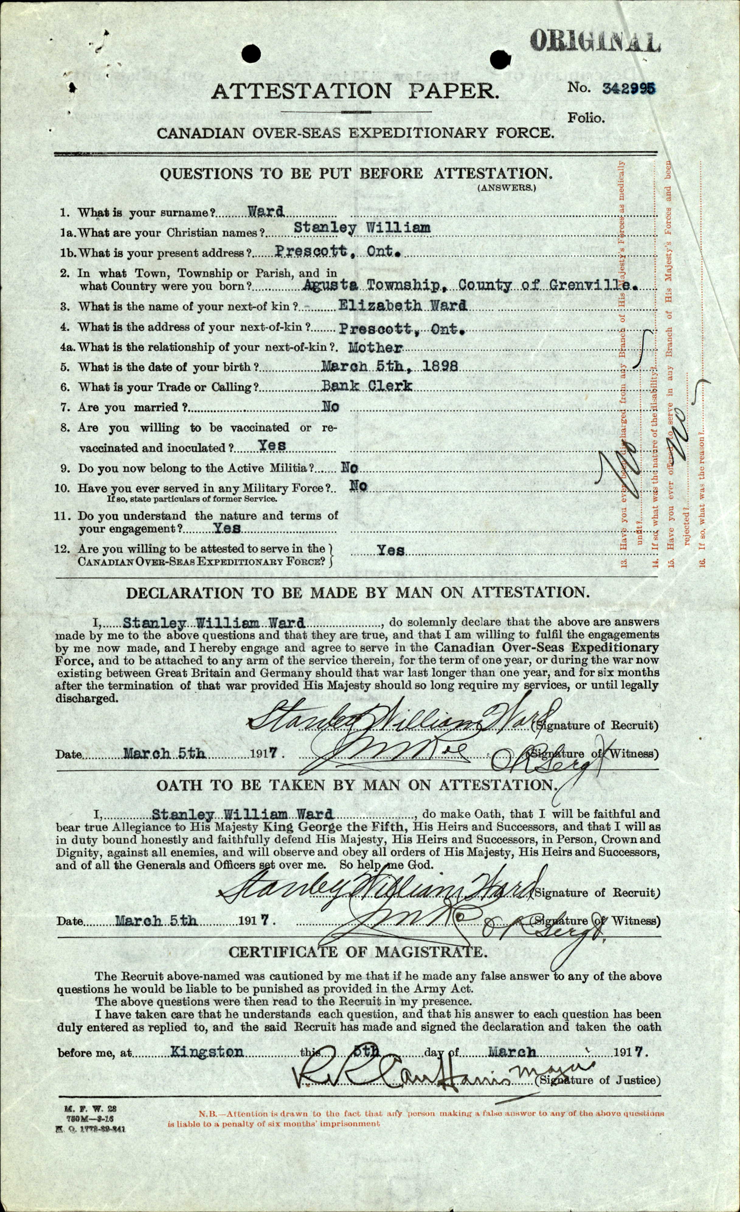 Son of William J. and Elizabeth Ward of Prescott, Ontario. Served in England only.