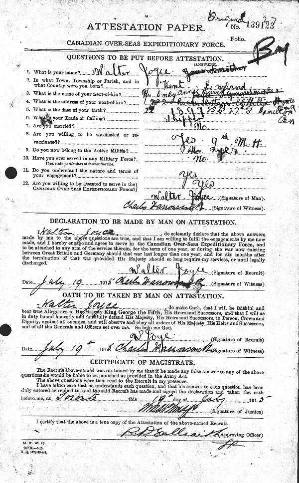 Son of Stephen Joyce and Fanny Hunt. Wounded at Vimy Ridge, April, 1917. Born at Wrotham, Kent, England.