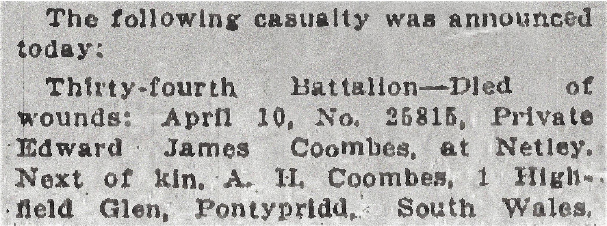 Son of Albert Henry and Annie Henrietta Coombes, of Neath, Wales.