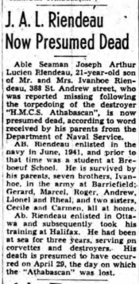 The province of Ontario honoured Able Seaman Riendeau by naming Riendeau Lake in his honour.