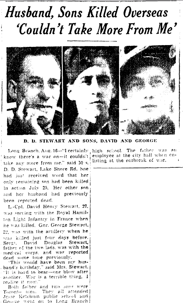 Son of Henry and Lucinda Bella Stewart of Toronto, Ontario; husband of Mary Lillian Stewart, of New Toronto, Ontario. Father of Lillian, Mabel, Gertrude and Helen, Lance Corporal David Henry Alexander Stewart, Royal Hamilton Light Infantry, killed in action 25 July 1944 and Gunner George Irwin Stewart, Royal Canadian Artillery, killed in action 21 July 1944.