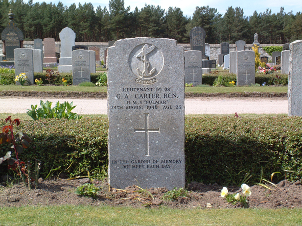 Lossiemouth is a seaport town and coastguard station on the Moray Firth, some five miles due north of Elgin. The burial ground lies between the railway station and Spynie Canal, about a mile and a quarter from the railway station, and it contains war graves of both world wars. There was a Royal Air Force Station at Lossiemouth and when war broke out in 1939 there was already an Air Force plot in the burial ground. This was used for the majority of the service war burials, and only 23 are elsewhere in the cemetery. This plot lies to the right of the main entrance; the Cross of Sacrifice stands at the summit of a slope facing the graves. Inevitably there are a small number of pre-war Air Force graves among the war graves, and three men of the Royal Navy and one belonging to the Royal Canadian Navy who died after the war have also been buried here.
