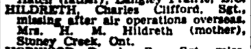 Son of Harvey M. Hildreth, and of Clara J. Hildreth (nee Hendershot), of Stoney Creek, Ontario, Canada.