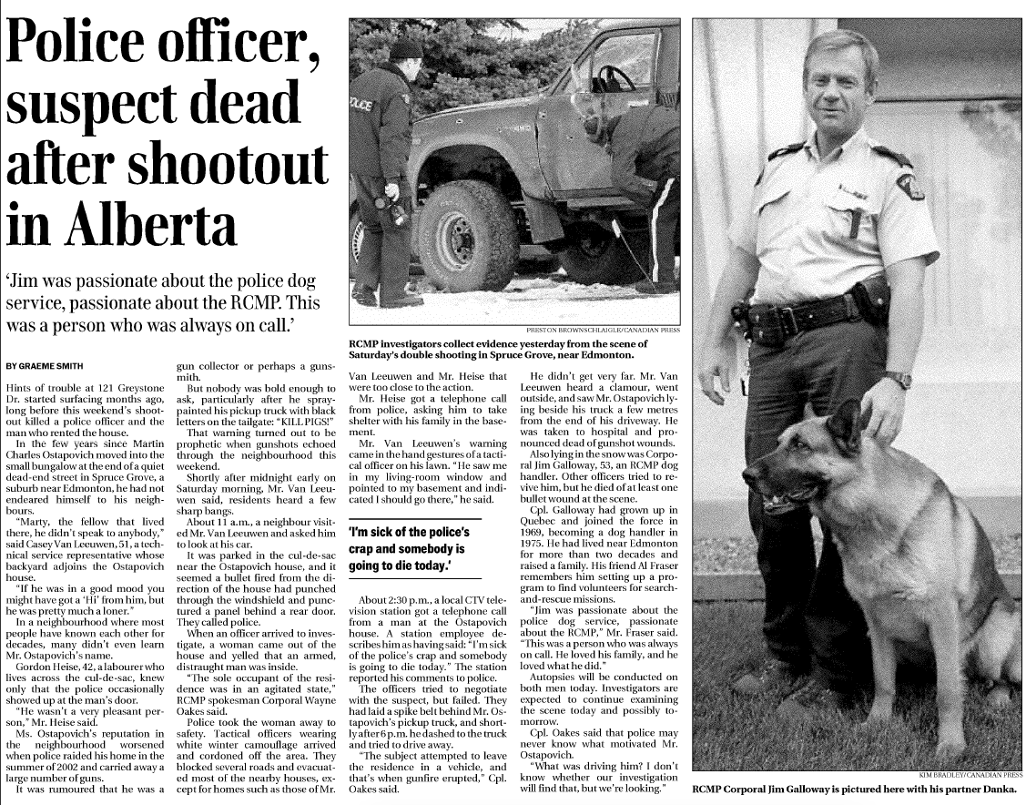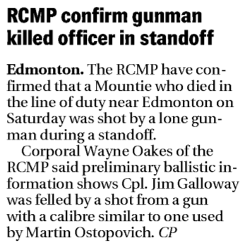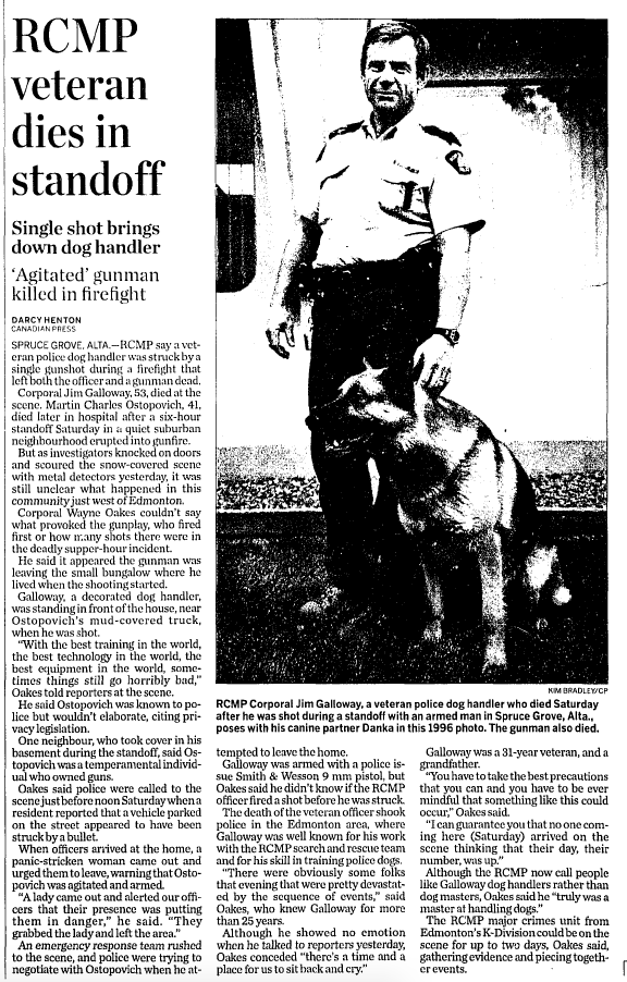 Cpl. Galloway’s passion was being a dog handler. He helped organize the civilian Search And Rescue (SAR) dog association in Alberta, and was a pioneer in SAR training methods, as well as cadaver searching. Cpl. Galloway was married, had 3 children and 8 grandchildren. He enjoyed fishing, and owned small picture framing business. Cpl. Galloway crashed his police vehicle into a pickup in an attempt to get it to roll over, but it did not. He got out of his police vehicle and was running for cover when he was shot.