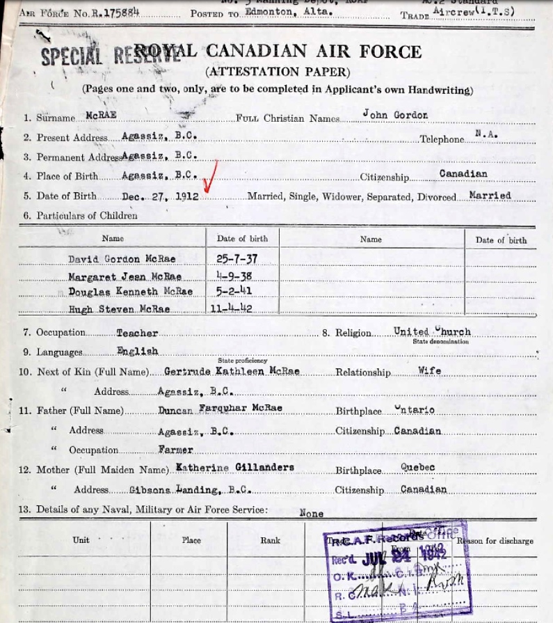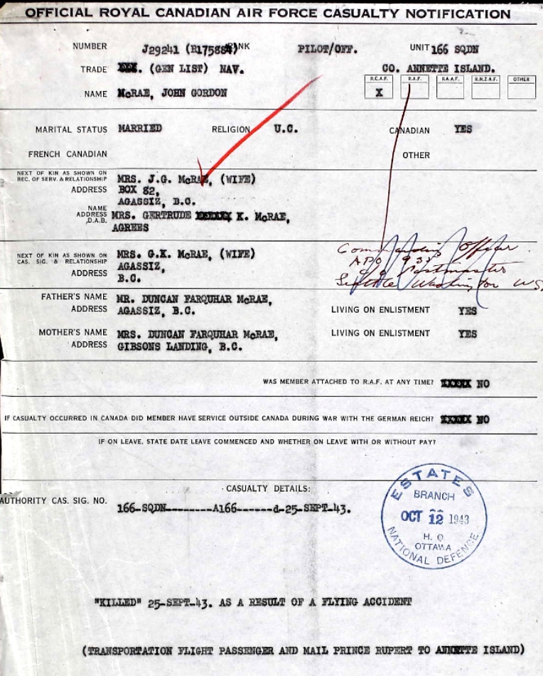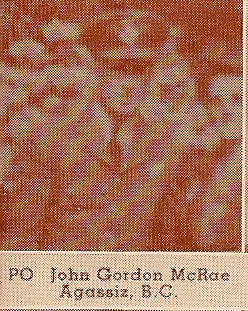 Son of Duncan and Katherine McRae, of Agassiz, British Columbia; husband of Gertrude McRae, of New Westminster, British Columbia.