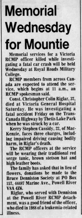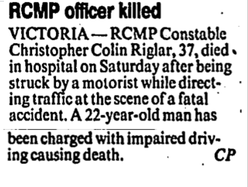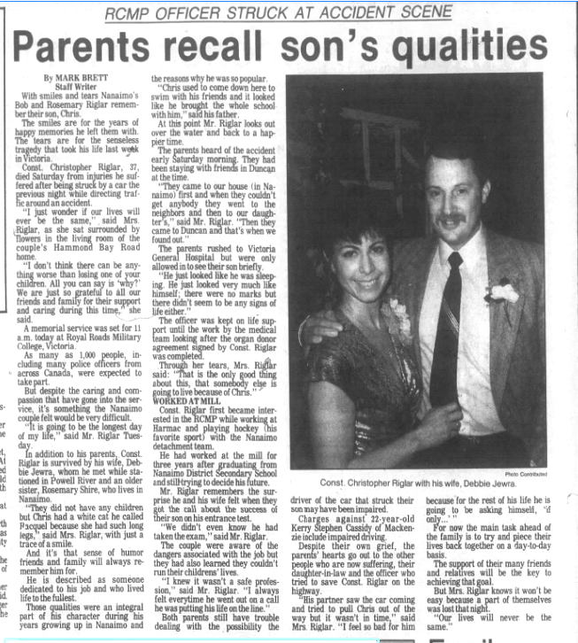 Cst. Riglar was born in Nanaimo, British Columbia. He served in several detachments in his home province and was married to Debra.