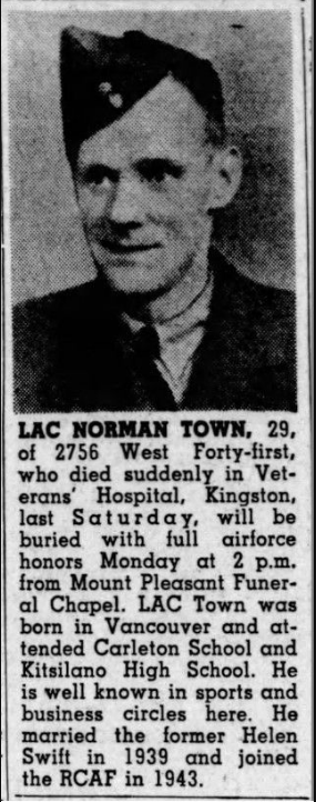 Son of Frank Vernon Town and Mary Kate Town, of Vancouver; husband of Helen Mary Town, of Vancouver.