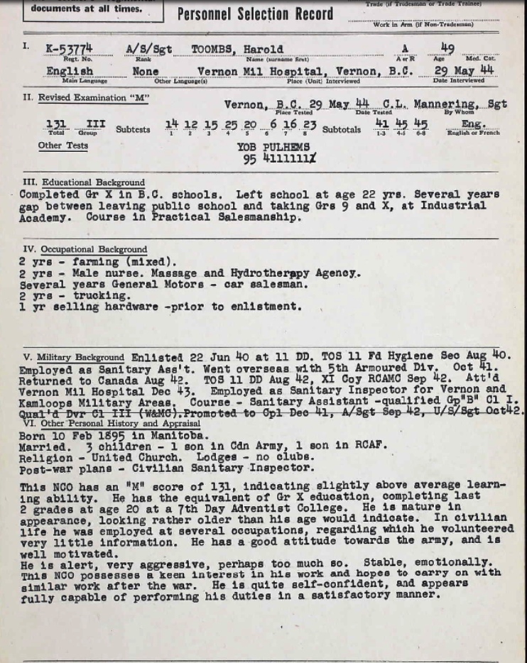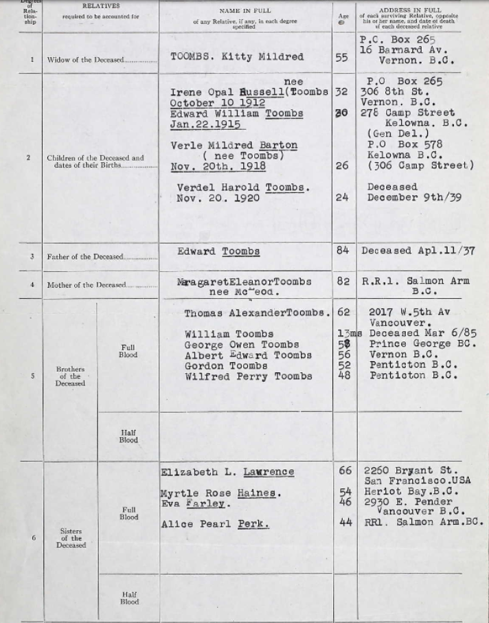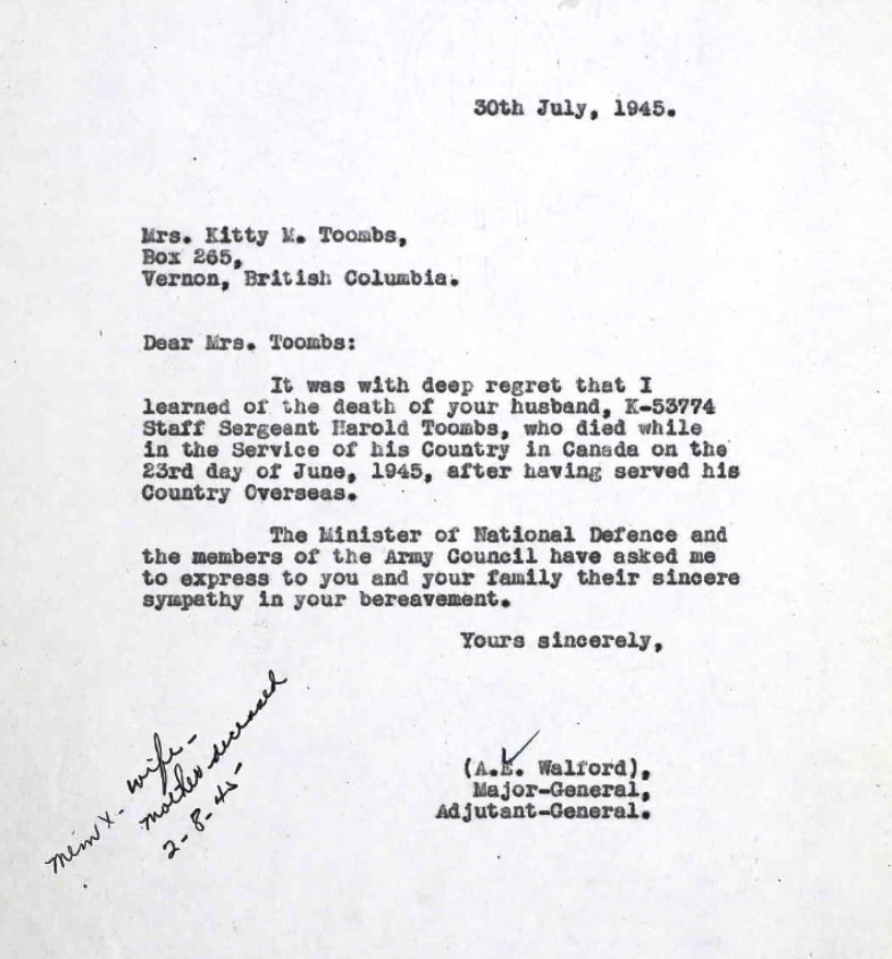 Son of Mrs. E. Toombs, of Salmon Arm; husband of Kitty M. Toombs, of Vernon.