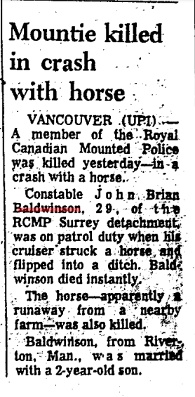 Cst. Baldwinson was born in Gimli, Manitoba. He was an excellent athlete who played a variety of sports and particularly loved hockey. At 1:30 am, Cst. Baldwinson passed another police car and ended up hitting a horse that had wandered onto the highway. He was married to Nancy who was pregnant with their second child, Darren. His first born, Barry, was 2 years old at the time of Cst. Baldwinson’s death.