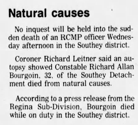 Constable Bourgoin was born in Vancouver, British Columbia. Before his career with the RCMP, he was a Queen's Scout and an auxiliary police officer. During his career, he was stationed in various locations within Saskatchewan. Constable Bourgoin enjoyed his work as a police officer. His family included his wife, Donna, and their three children: Richelle, Edward, and Jolene. Constable Bourgoin is buried at the RCMP cemetery at "Depot" Division.