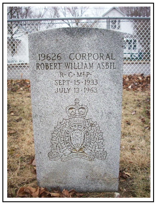 Cpl. Asbil was born in Rawdon, Quebec. Prior to joining the Force he attended Agriculture College and managed farms and a ranch. He was in line for commendation for having solved a difficult murder case and was one of the best revolver shots in the RCMP. Cpl. Asbil and three other members died in an RCMP aircraft which crashed when attempting to land at Carmacks, Yukon Territory. Cpl. Absil was married to Joyce and they had a daughter.