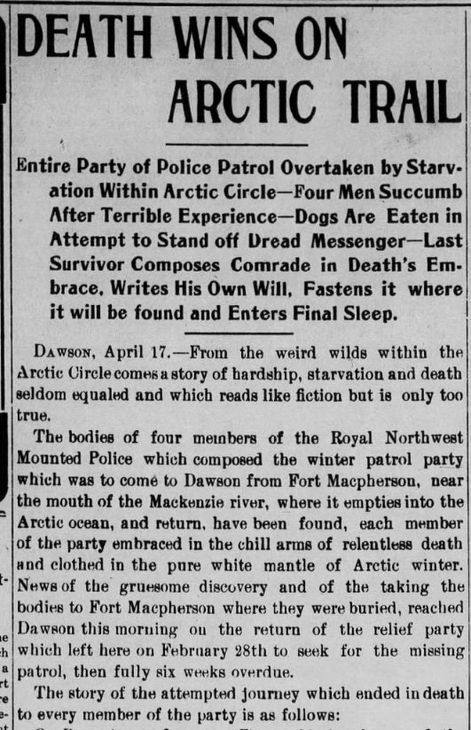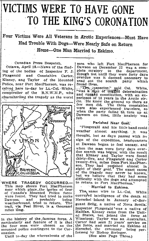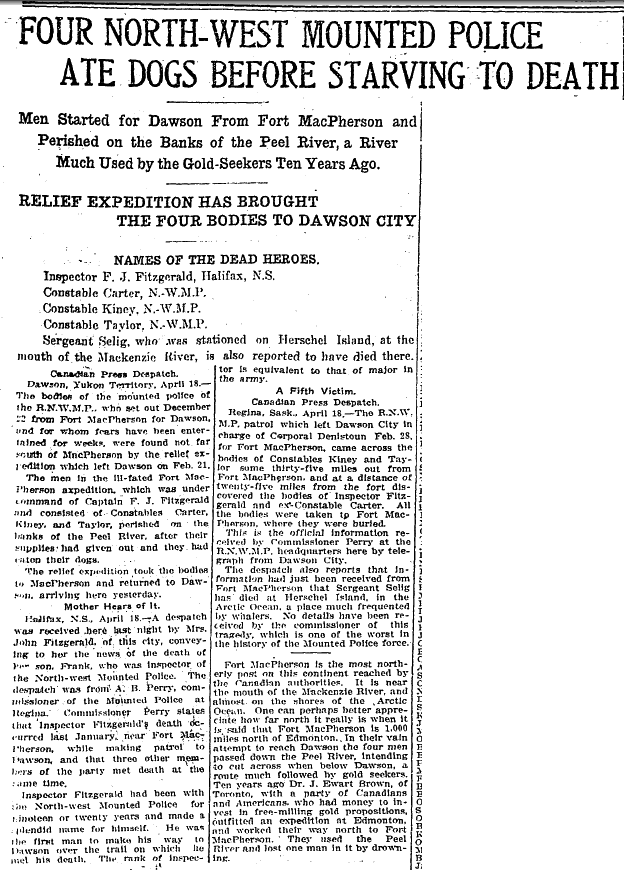 Constable Kinney was born in the USA and served in the American army. He died from starvation, exposure and exhaustion while a member of the MacPherson Dawson patrol.