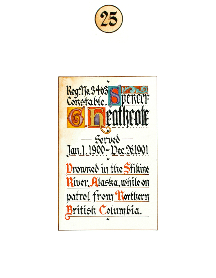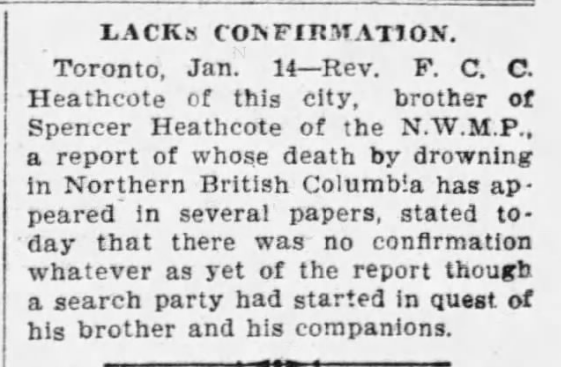 Constable Heathcote was originally from England and previously worked as a machinist and served in the Canadian Militia. He drowned in the Stikine River, Alaska, while on patrol from Northern British Columbia.