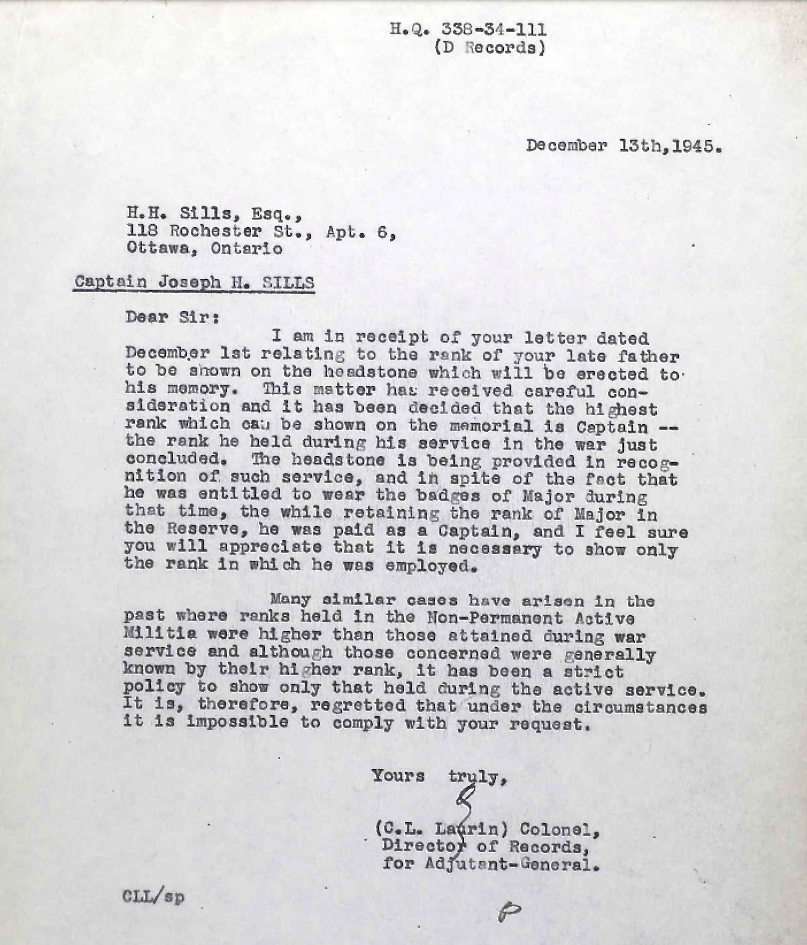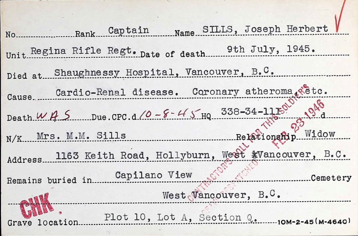 Husband of Mabel Mary Sills, of West Vancouver, British Columbia. Captain Sills also fought in the First World War, attaining the rank of Staff Sergeant Major with the 14th Calgary Light Horse, later known as the 14 Hussars.