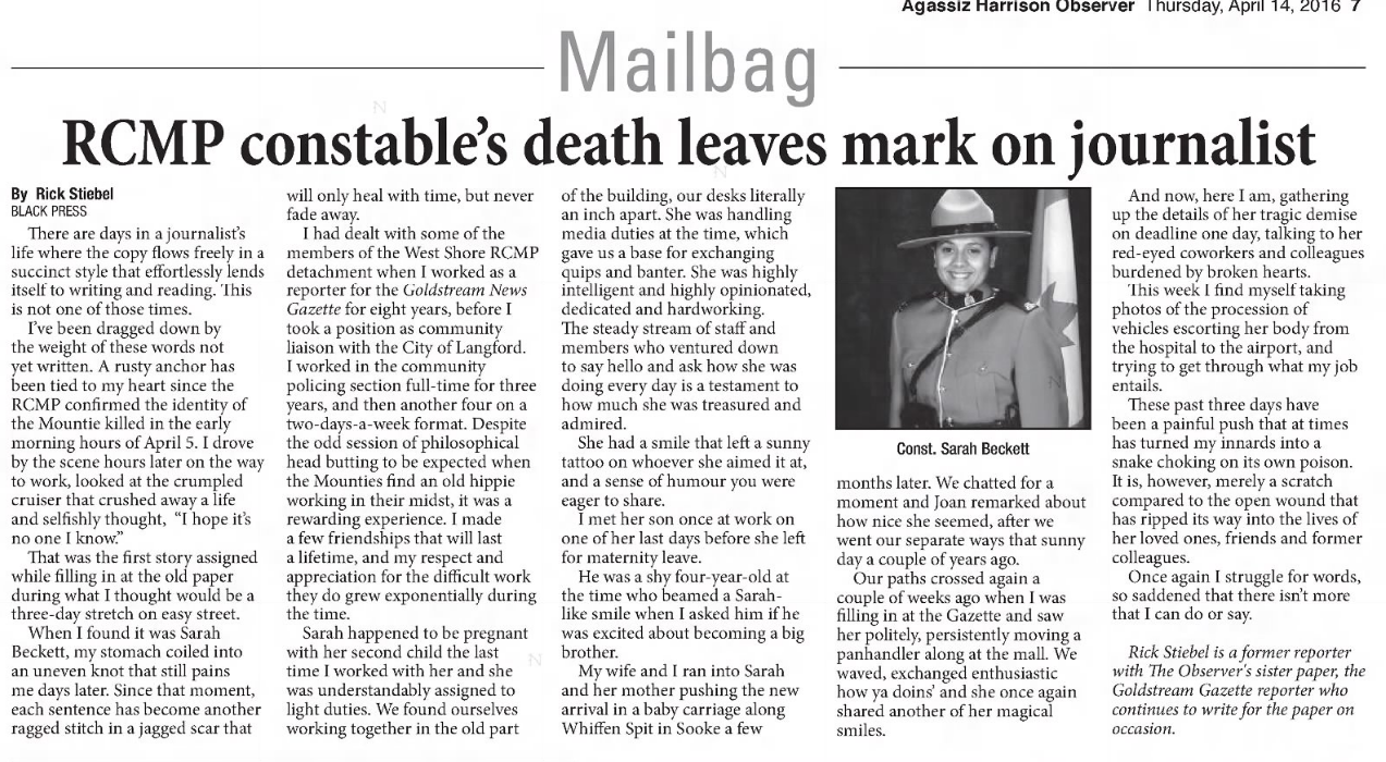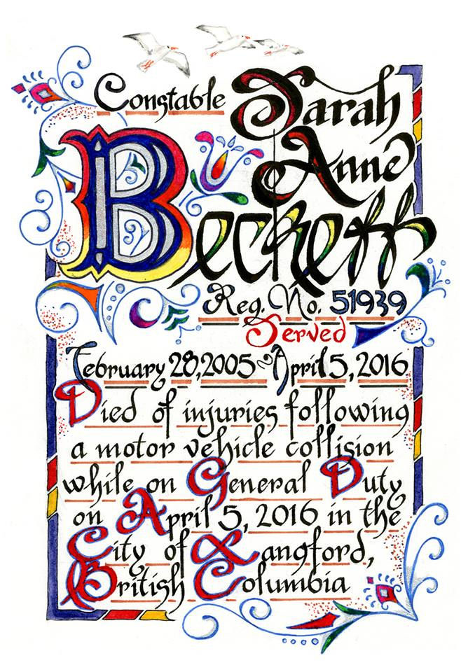 Cst. Sarah Beckett was born in Calgary, and grew up in Victoria, British Columbia. She died when her police car was struck by a driver who had failed to stop for another officer on April 5, 2016 in Langford, British Columbia.