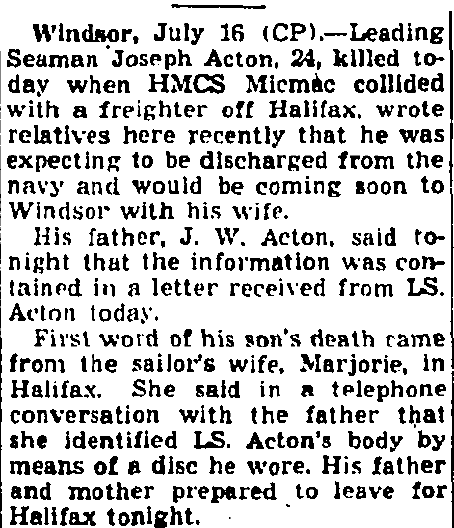 Son of Joseph Acton and Mary Lane, of Windsor, Ontario. Husband of Marjorie Phyllis Morris, of Halifax, Nova Scotia.