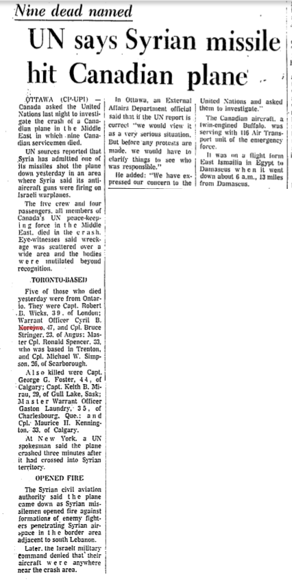 He was one of nine Canadian Forces personnel killed on United Nations Flight 51 on August 9, 1974. Their Canadian Forces Buffalo, 115461, was on a scheduled supply flight from Ismailia, Egypt, via Beirut, Lebanon, to Damascus, Syria. Shortly after crossing the Lebanese-Syrian border into Syria, three surface-to-air missiles were fired at the Buffalo by Syrian forces, destroying the aircraft and causing the deaths of all aboard.