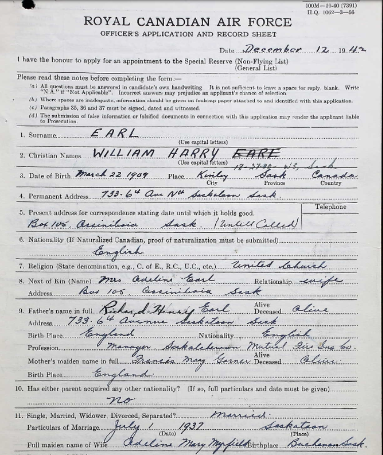 Son of Henry Richard and Frances Mary Earl, of Saskatoon; husband of Adeline Thelma Earl, of Saskatoon.