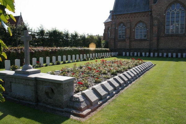 Zeebrugge Churchyard is located in the Port town of Zeebrugge itself on the Sint Donaasstraat. The cemetery is approached via the N34 Kustlaan which passes through the town of Zeebrugge. Having passed the ferry port terminal continue northwards along the N34 (following the route of the tramlines) for 1.5 km. Sint Donaas church is a large red brick building with a slate roof. Having seen the church on the right hand side, turn right of the N34 onto the Sint Donaas kerk straat. The Commission cemetery is at the far right side of the churchyard surrounded by a red brick wall.