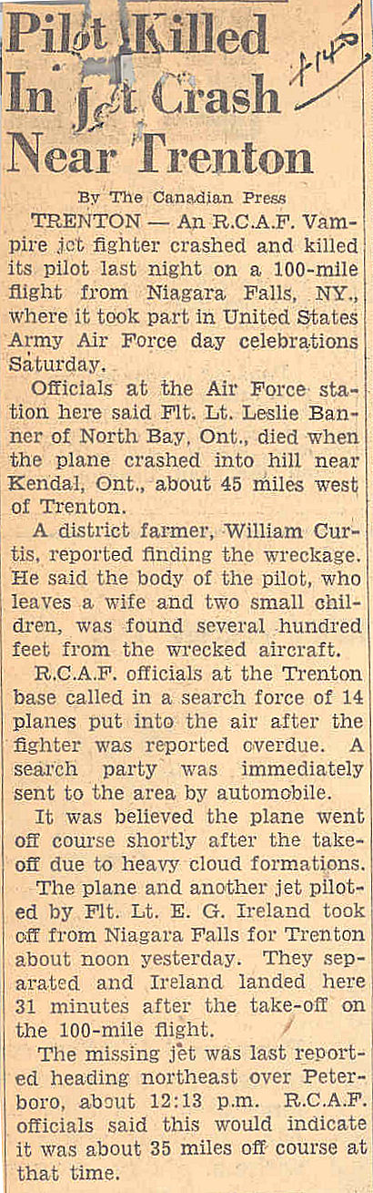Son of Edward Leslie and Edith Mary (née Wallace) Banner of North Bay, Ontario. Husband of Dorothy Eugenie (nee O'Neil) and father of Leslie Jane and Stephen Alexander of Trenton, Ontario. He was survived by four sisters.
