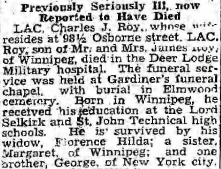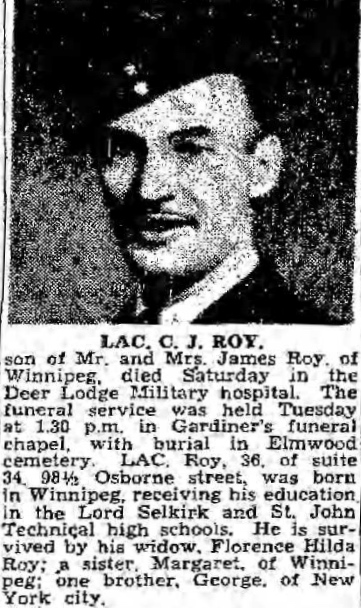 Son of James R. Roy and Edith E. Roy, of Winnipeg; husband of Florence H. Roy, of Winnipeg.