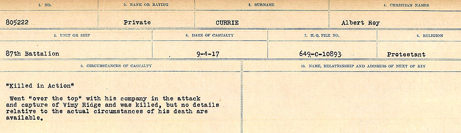 Son of Donald and Minnie Currie of Bolsover, Ontario. Prior to his enlistment with the 136th Battalion, Private Currie had one year's experience with the 14th Field Artillery and was employed as a baker.