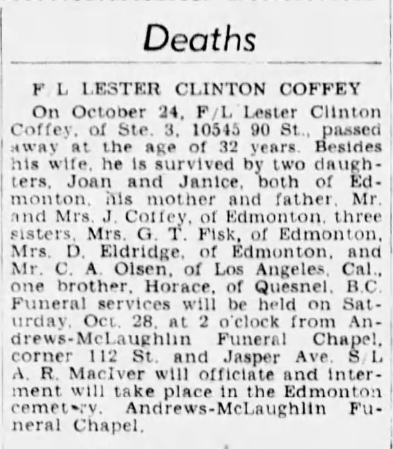 Son of John Richard and Myrtle Fern (nee Barbour) Coffey of Edmonton, Alberta. Husband of Anne Kathleen (nee McKenzie) and father of Kathleen and Janice of Edmonton, Alberta. Brother of Hornce, Ida, Barbara and Gladys.