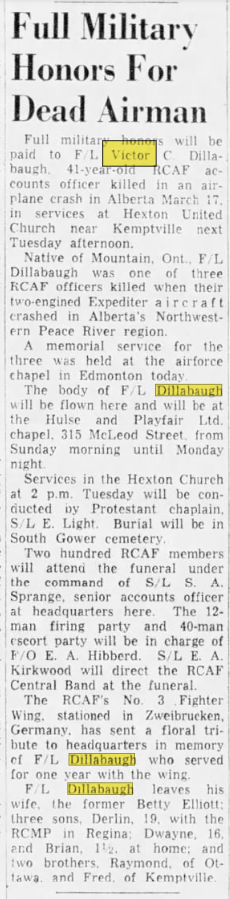 Son of deceased parents, Robert and Elizabeth (nee Walter) Dillabaugh. Husband of Betty (nee Elliott) and father of Derlin, Dwayne and Brian Dillabaugh of Osgoode, Ontario. Brother of Wilfred and Raymond Dillabaugh.