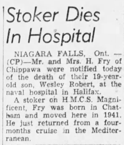 Son of Hector Sylvester Fry of Chippawa, Ontario and Audrey Margaret (nee Powers) Fry of Niagara Falls, Ontario.