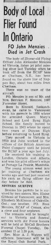Son of Bertram and Mabel (nee McLean) of Victoria, British Columbia. Brother of Pilot officer B.R Menzies, Elaine and Joan.