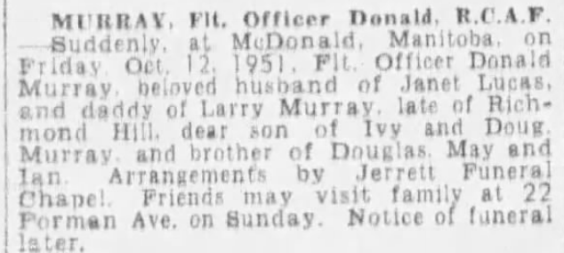 Son of Douglas and Ivy Murray of Toronto, Ontario. Husband of Janet Murray of Willowdale, Ontario. Father of Lawrence Murray. Brother of Douglas, Ian and Ivy Murray.