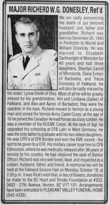 Husband of Elizabeth Louise (née Douthwright) and father of Tracie Lynn Donesley of Falkland, British Columbia.