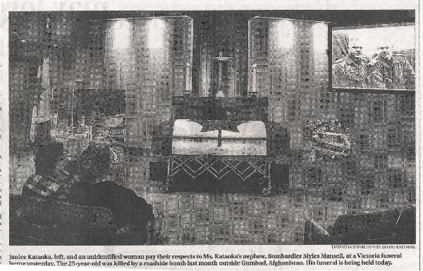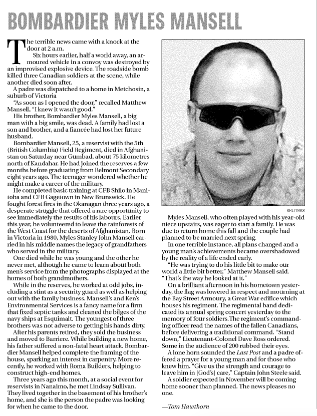 At his wake, beside his casket, stood a lone wreath. The inscription read, 'Thank you from all British Columbians'. It was sent by Lieutenant-Governor Iona Campagnolo. Bombardier Mansell was known to many as 'Smiley Myley' which aptly described him. As a child, he came home from school one day crying because the teacher told the students 'miles' would be replaced by 'kilometres'. He thought he would have to change his name.