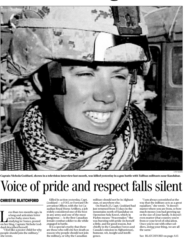 "She loved her job, loved what she did," her husband, Jason Beam said from their home in Shilo, Manitoba. "She was glad to be in Afghanistan." Captain Goddard was known as a reader and dog lover who volunteered with the Girl Guides. "She wanted to be remembered as a really, really good soldier, not as a female officer, a female soldier or a first of anything" shared her former supervisor, Major Anne Reiffenstein. Credit: The Globe and Mail, Thursday, May 18, 2006.
