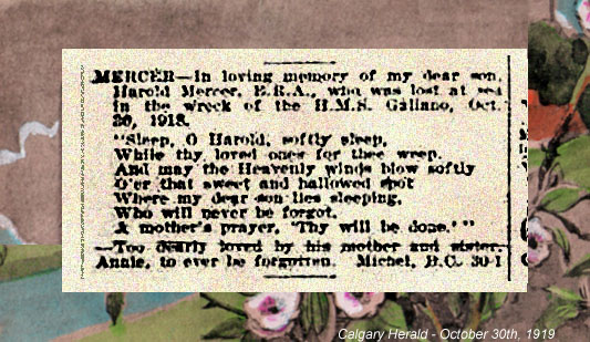 On Vancouver Island in Ross Bay Cemetery, British Columbia, is the VICTORIA MEMORIAL. The cemetery holds 133 war graves and contains, in a separate plot, the Naval Memorial which consists simply of a square block of granite bearing the names of 39 officers and men who were lost or buried at sea in the Pacific Ocean. Of these, 36 were from the HMCS Galiano which went down on October 30, 1918. Behind the VICTORIA MEMORIAL stands a Cross of Sacrifice.