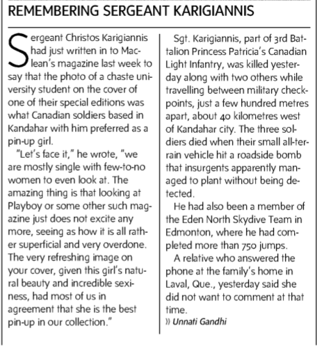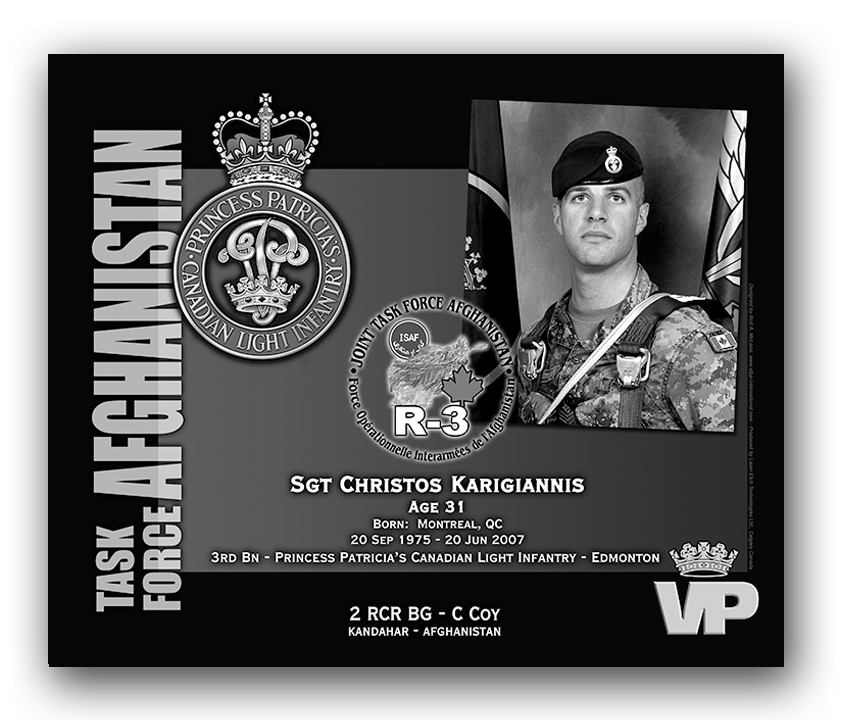 Sergeant Chris Karigiannis was killed along with two fellow soldiers, when their vehicle struck an improvised explosive device on June 20, 2007, outside Kandahar, Afghanistan.