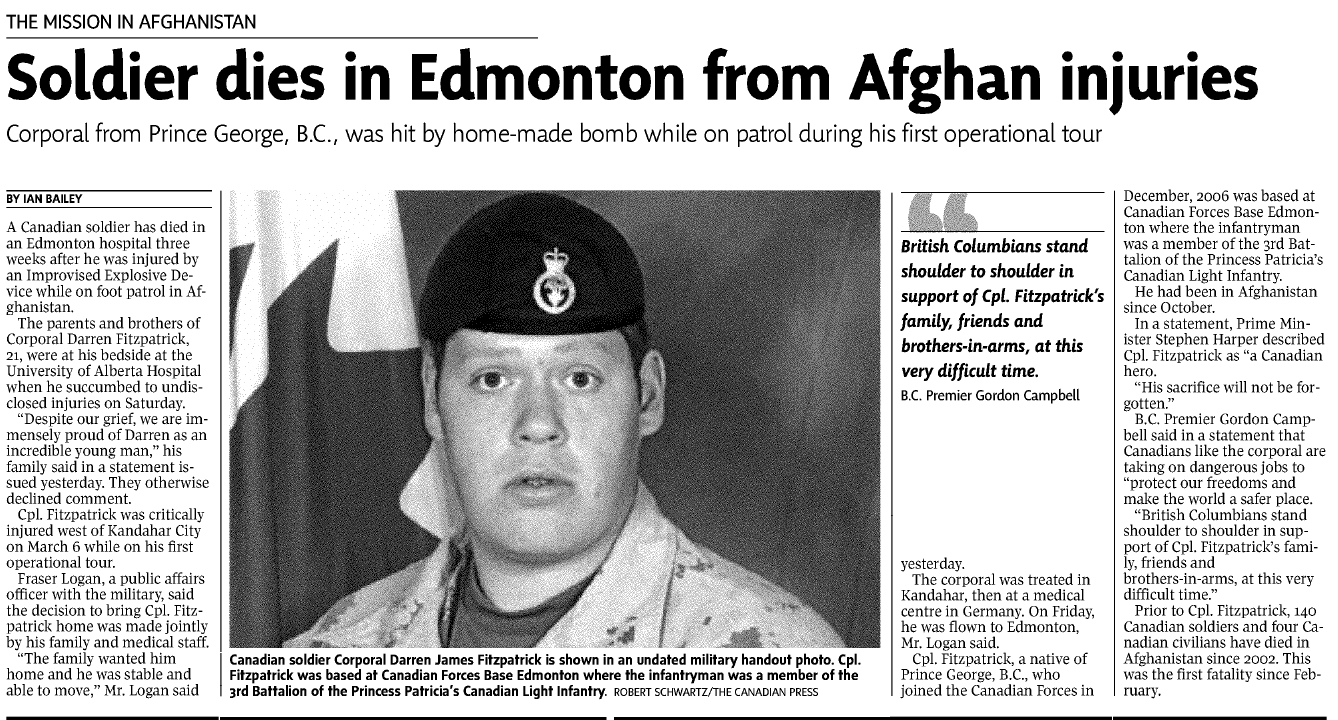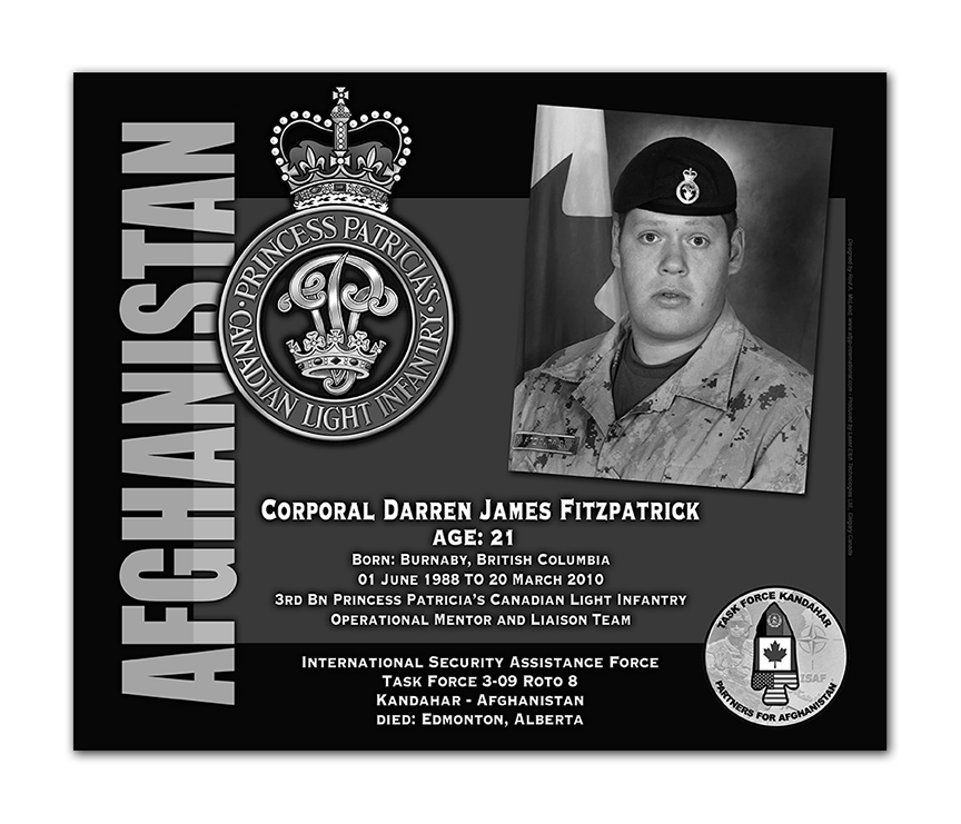 Son of James Neil and Colleen Rose Fitzpatrick (2016 National Memorial (Silver) Cross Mother) of Prince George, British Columbia. Brother of Michael and Sean.
