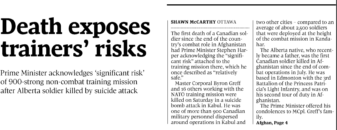 Byron was riding inside an armoured NATO bus when a suicide bomber detonated an explosives-filled car which impacted the bus. He was the first Canadian soldier to die during that training mission, and the last Canadian soldier to lose his life in Afghanistan.
