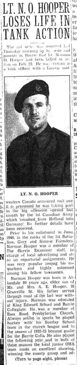 Lieut. Norman O. Hooper, 10th Armoured Regiment (Fort Garry Horse) - whose father was a World War I veteran of the Canadian Expeditionary Force - was killed in Holland (or, more properly, the Netherlands) on February 28, 1945. This article appeared in the Barrie Examiner newspaper (Barrie, Ontario) on March 15, 1945, at page 1. -